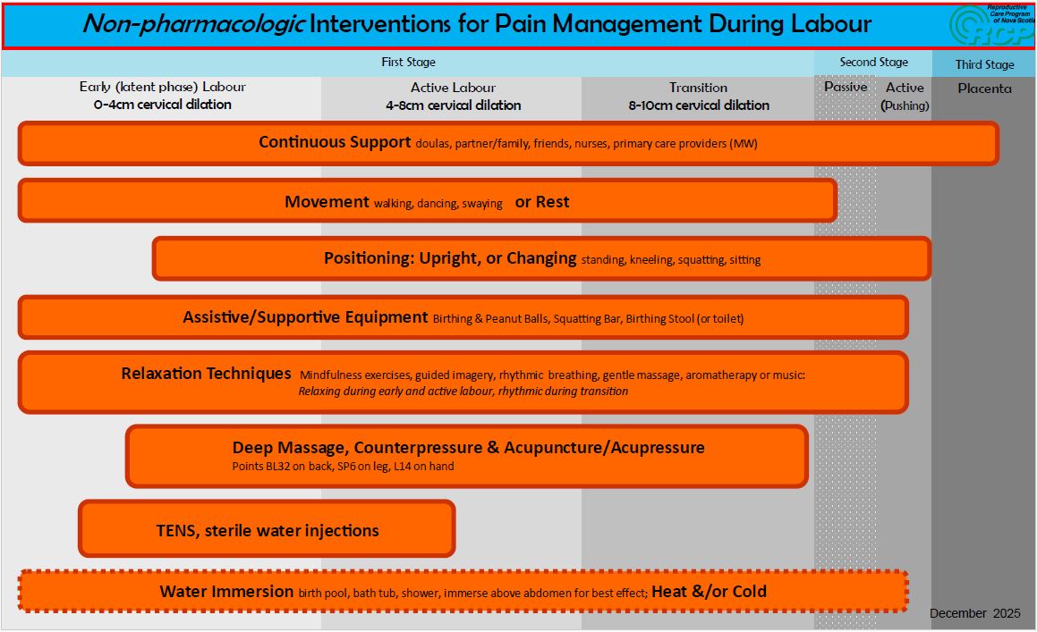 Labour is a dynamic process, with each birthing person experiencing the pain of labour differently. Effective pain management involves understanding the range of available strategies and choosing the options that best support comfort, control, confidence, and enhance coping throughout each stage of labour. This infographic outlines both non-pharmacologic and pharmacologic pain management techniques—highlighting practical, evidence-informed methods that can be used alone or in combination. By exploring these approaches, labouring individuals, care providers, and support persons can make informed decisions that align with personal preferences, clinical needs, and support the progression of labour.